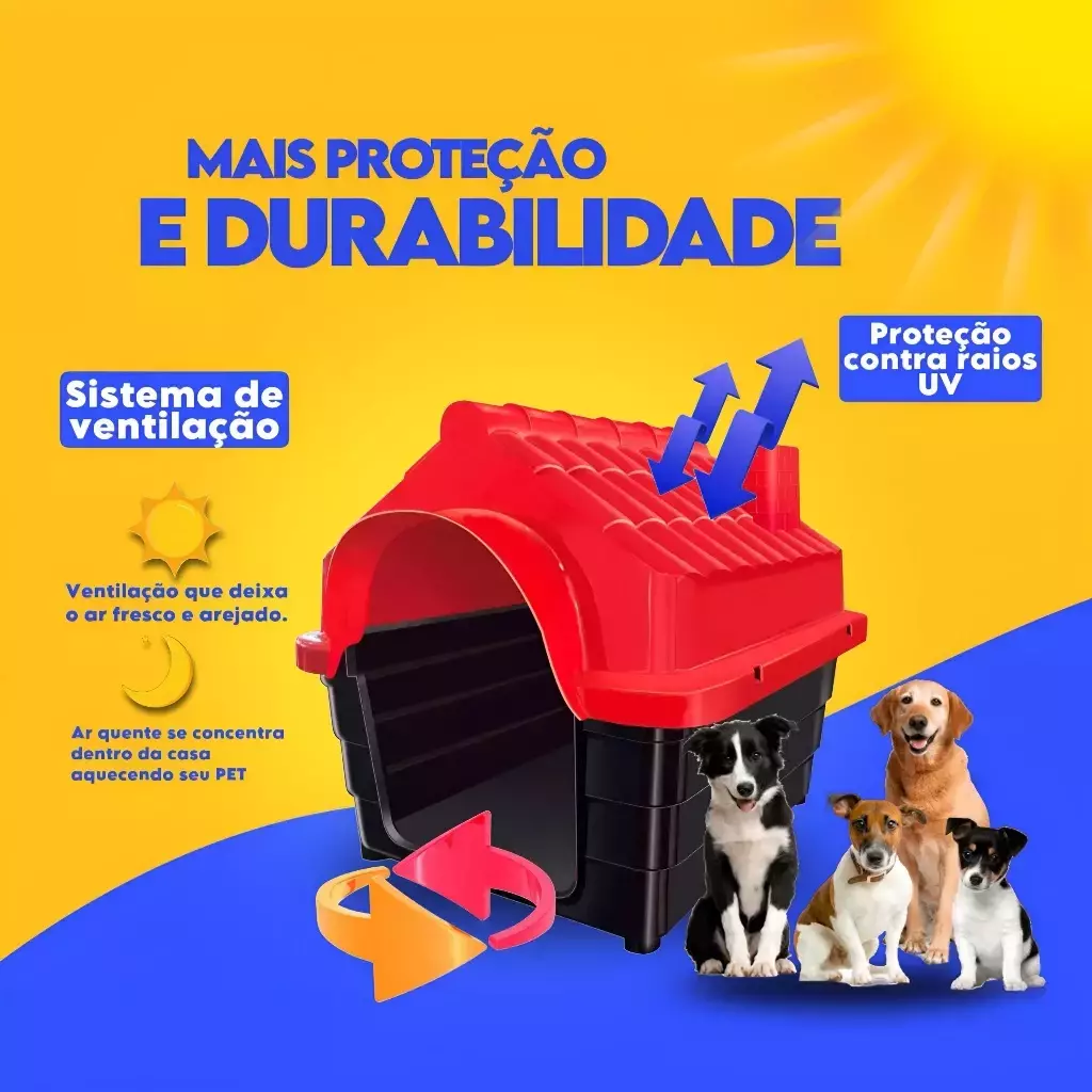 Com design prático e funcional, a casinha é fácil de limpar e movimentar, garantindo mais higiene e bem-estar para o seu companheiro. Além disso, seu tamanho versátil acomoda diferentes raças de forma confortável, tornando-se uma excelente escolha para áreas internas ou externas.